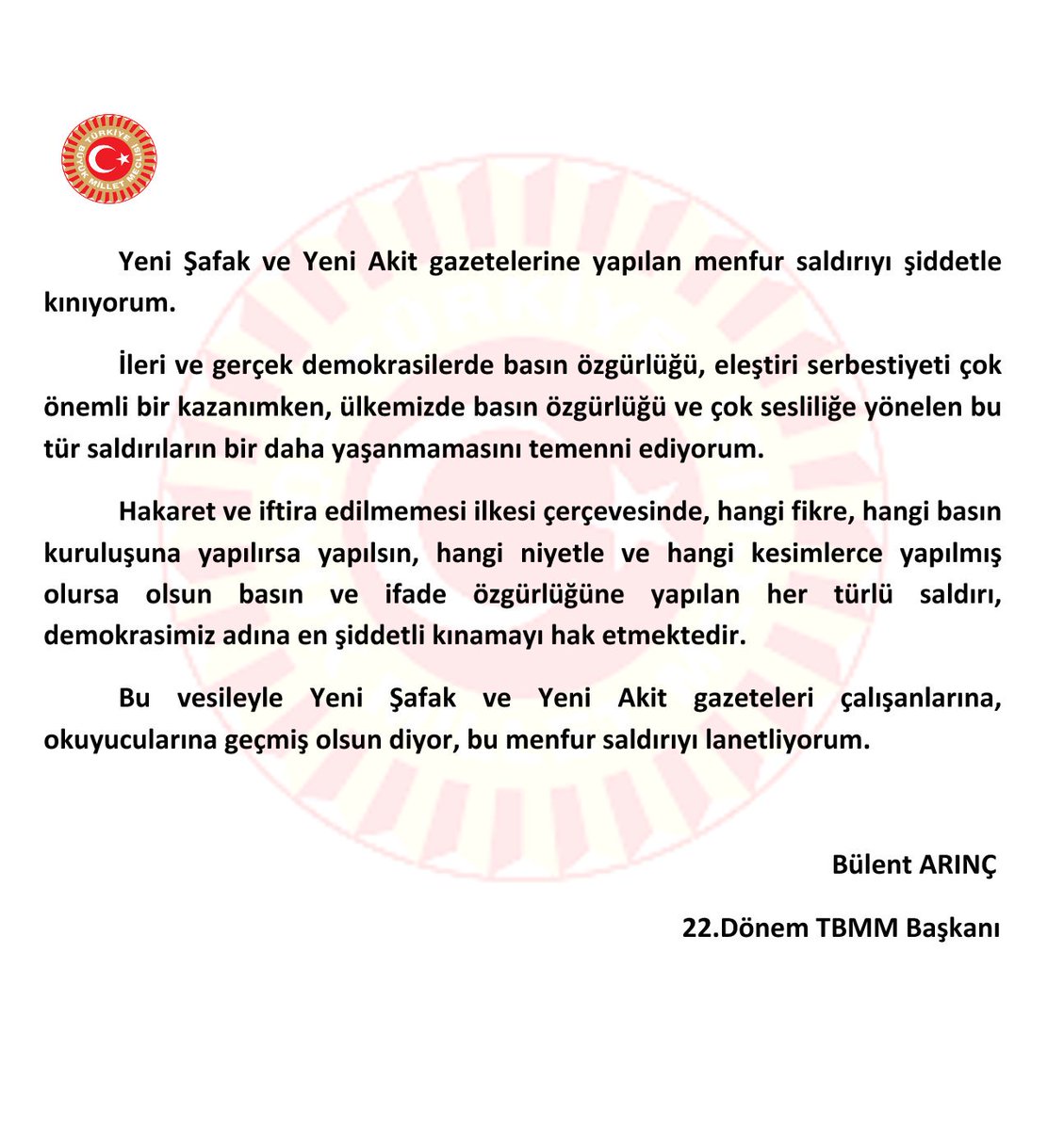 Yeni Şafak ve Yeni Akit gazetelerine yapılan saldırılara ilişkin mesajım :